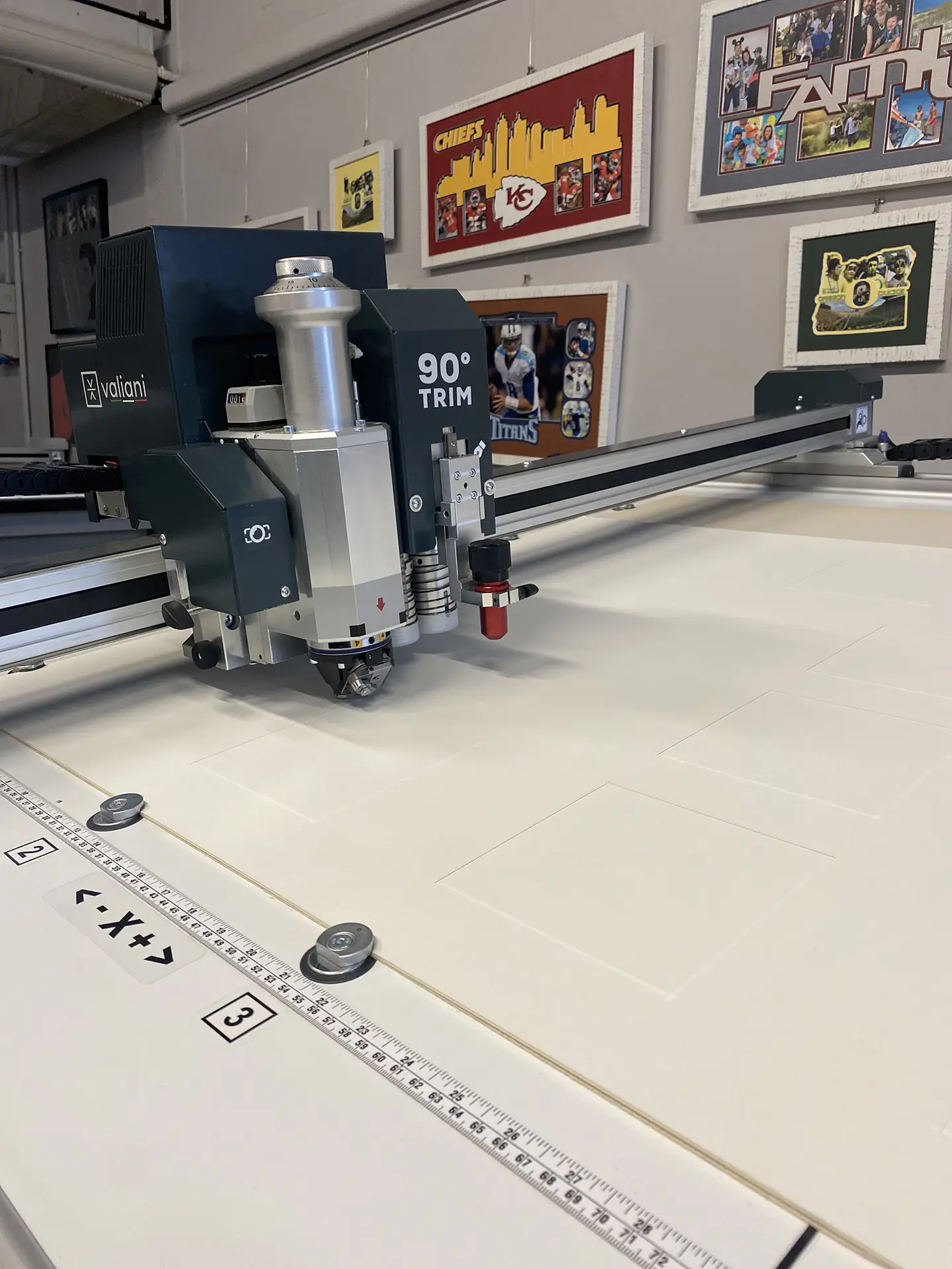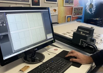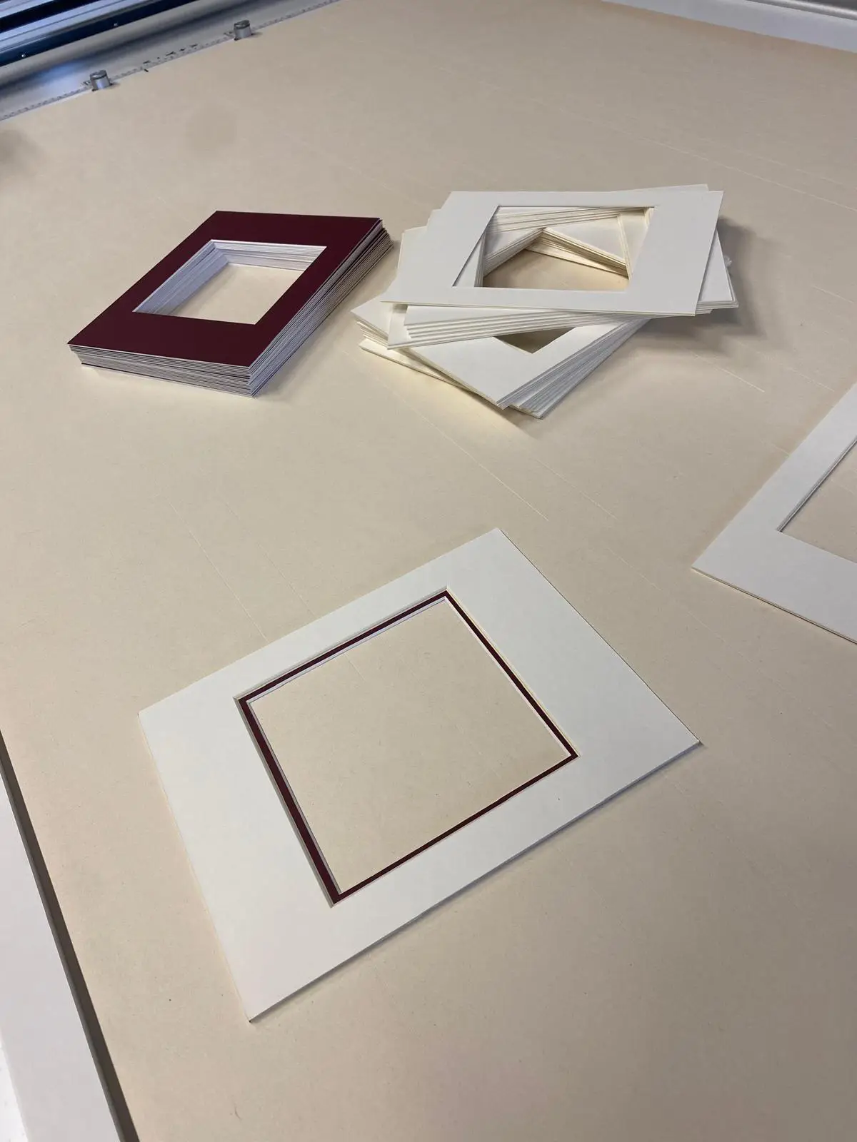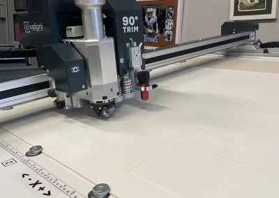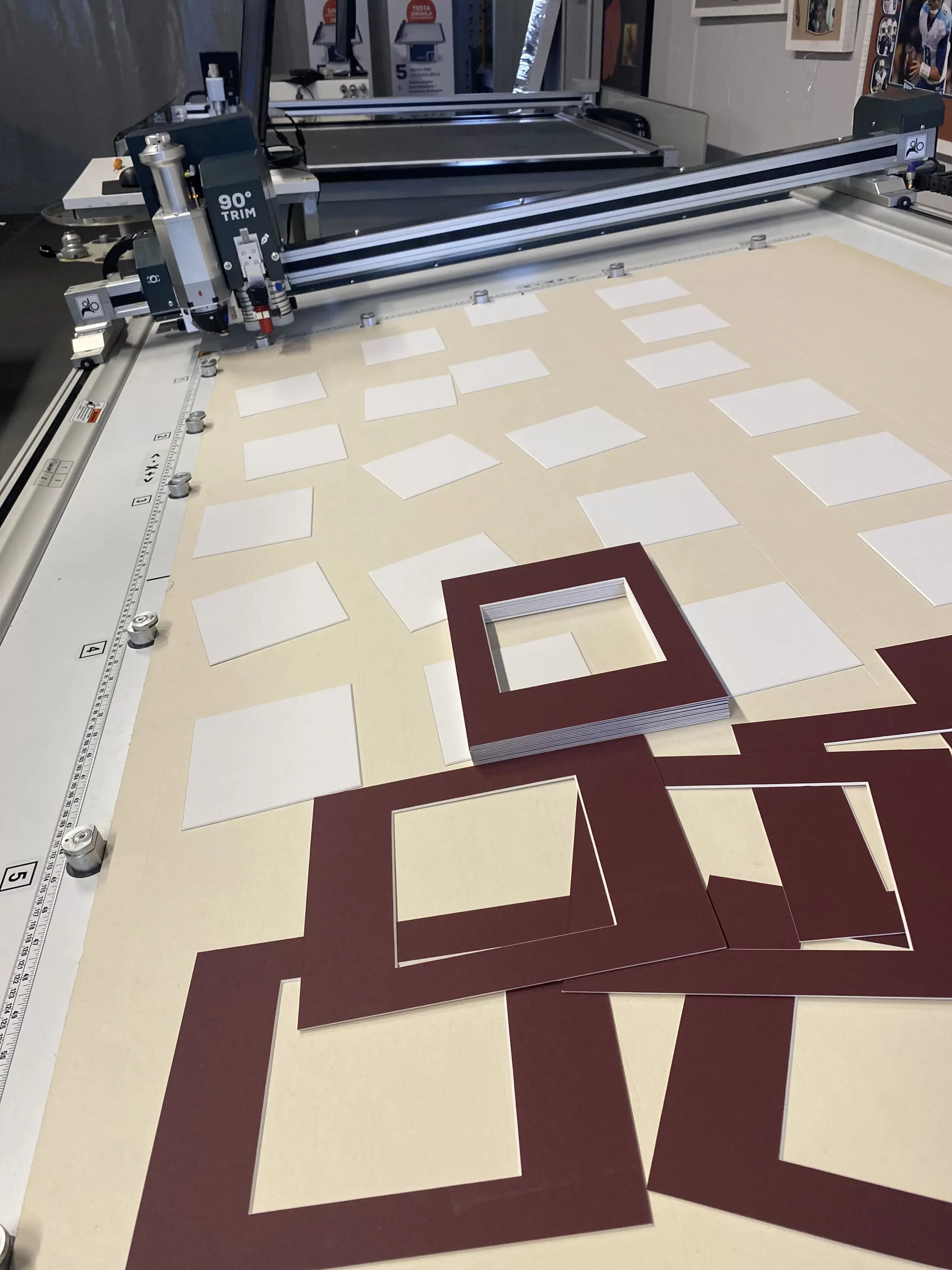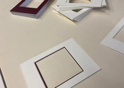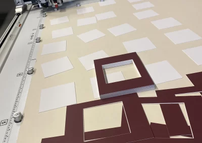 Place the 1.4 mm mountboard (we chose burgundy) face down and using the file previously created, start cutting the mats. Remember to remove the ” None (outside cut)” option. The machine will first make all 45° cuts with the blue head and will finish the process with the outside trim using the 90° Trimming Tool. Release the suction and remove the mats.