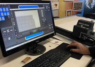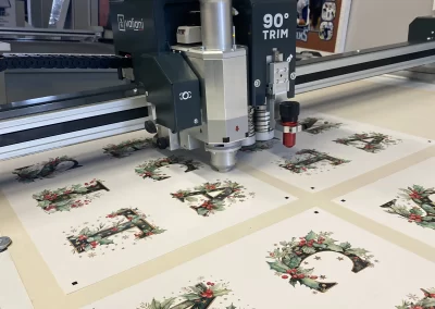After printing the cardstock and applying the print regmarks, place the sheets on the Nexus Edge V worktable. Turn on the suction pump and activate the vacuum to hold the materials. Launch the V-Studio software and import the cutting file. Using the OptiCrop software, position the camera on the first regmark and start detecting all the others. Once the detection is complete, perform the contour cut using the 90° head and wait until it ends. Release the suction and carefully remove all letters.