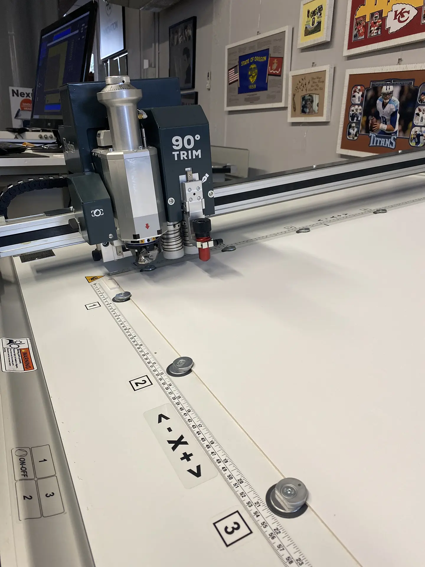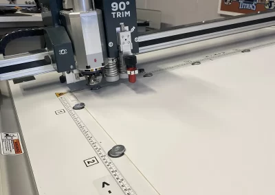 Place the backing board on the worktable. Using the previously created file, set “None (outside cut)” mode, and start the process. Before running the job, make sure no clamps are interfering with the process; if so, rotate them to deactivate them. Turn the vacuum pump on and hold materials using the vacuum lever. The 90° Trimming Tool will handle this task by trimming the edges switch max precision. When finished, release the vacuum and collect the backing boards.