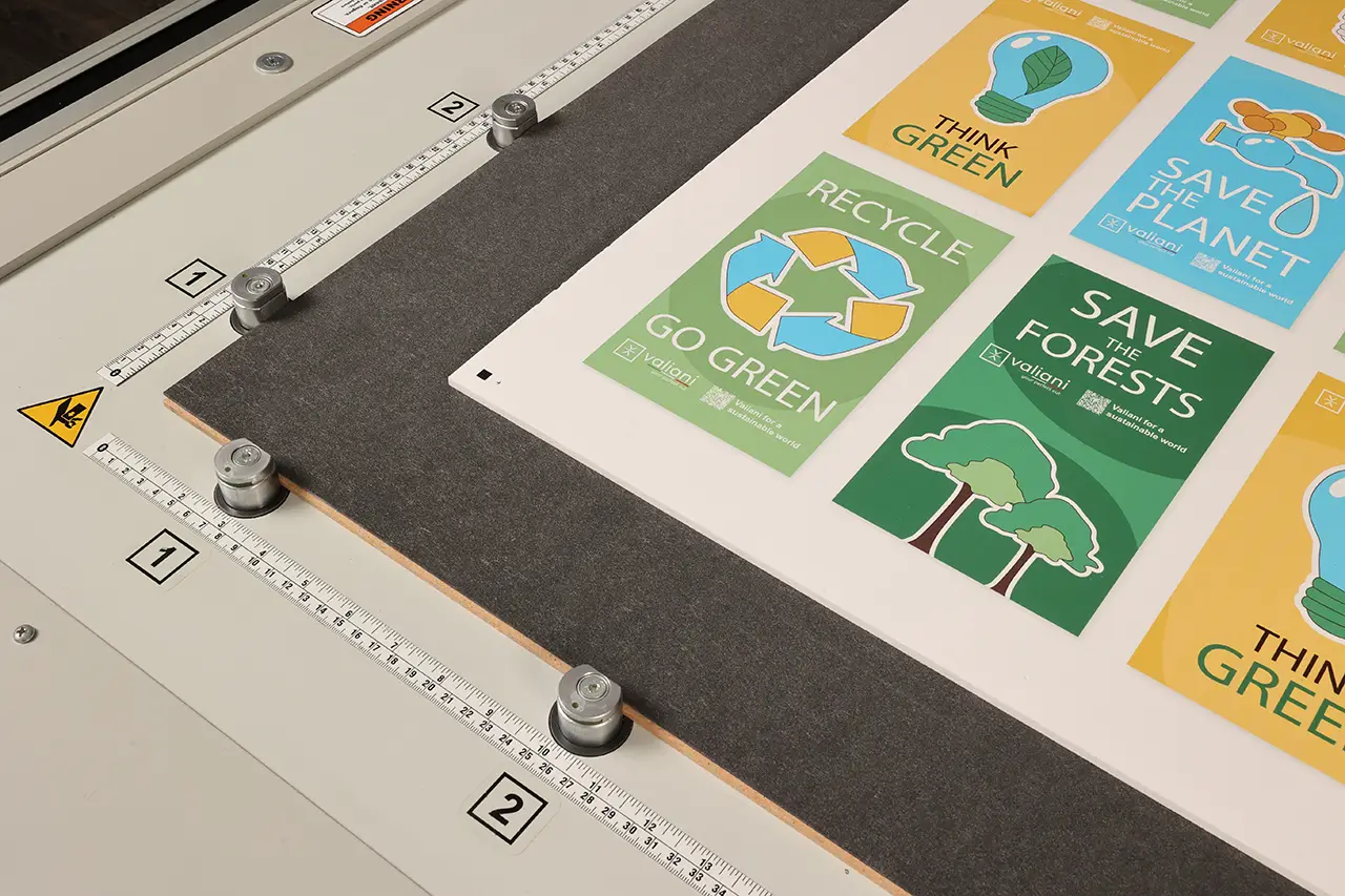Integra V Series offre una soluzione completa per il taglio, il mezzo taglio, la cordonatura e la fresatura, garantendo risultati ottimali su una vasta gamma di materiali. Il sistema integra una telecamera ad alta risoluzione che, combinata con un software opzionale, rileva automaticamente i registri di stampa per eseguire tagli di scontorno con rapidità e precisione assolute.