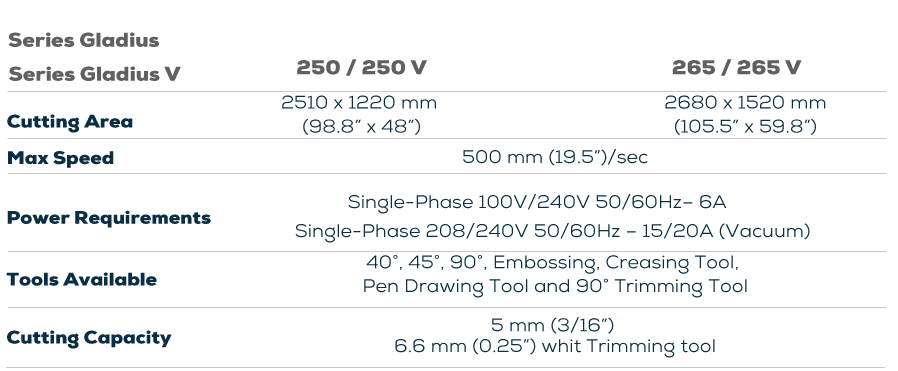 The Gladius series in its standard version features a pneumatic clamp-locking system. It is also available with a vacuum table and suction pump for greater efficiency.